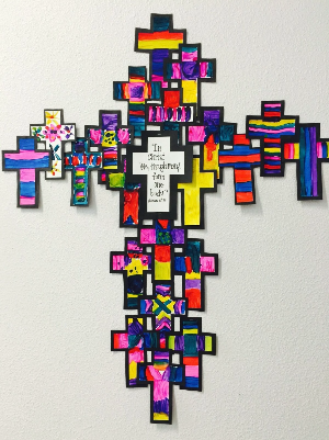 십자가를 다양하게 꾸민 후, 십자가 대형으로 배치하여 협동작품 완성하기.