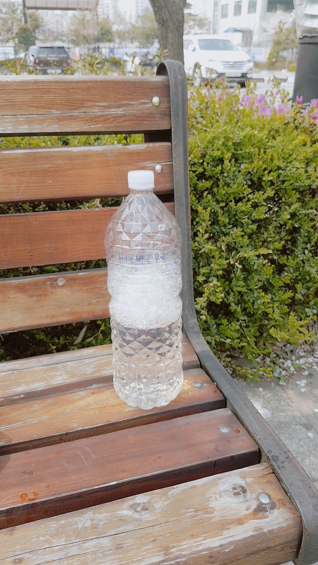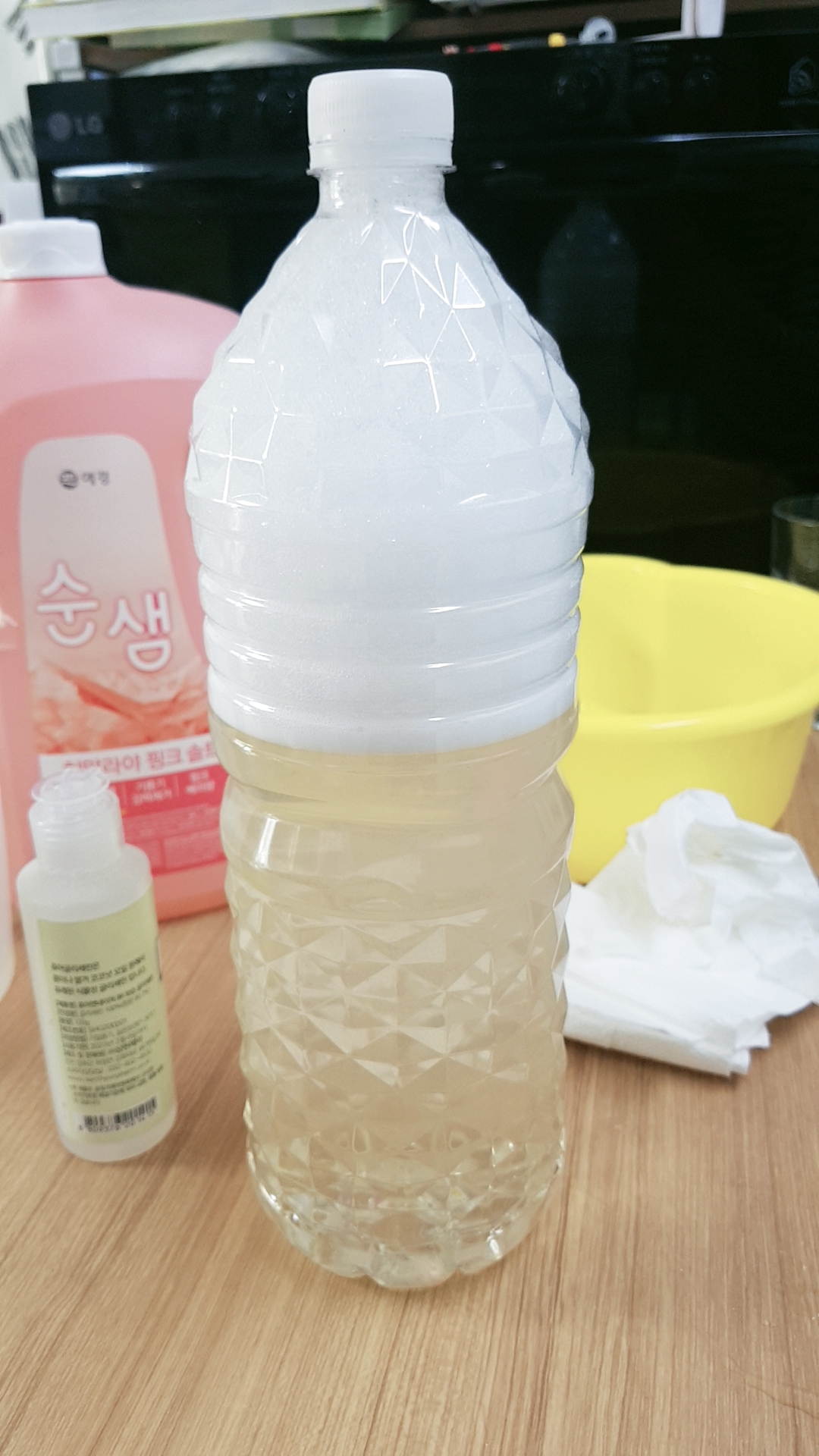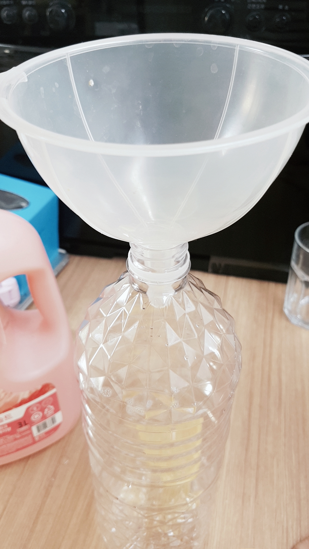 다 마신 생수병 1.5L에 깔떼기를 꽂아서 용액을 넣어줍니다. 붓다보면 깔떼기와 생수병 맞닿은 부분에 거품이 올라올거에요. 천천히 부어주는 게 좋아요. 거품이 생기면 나중에 닦아주면 되지 놀라지 마세요 ㅎㅎㅎ