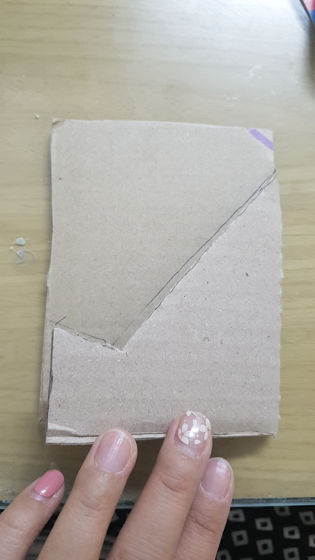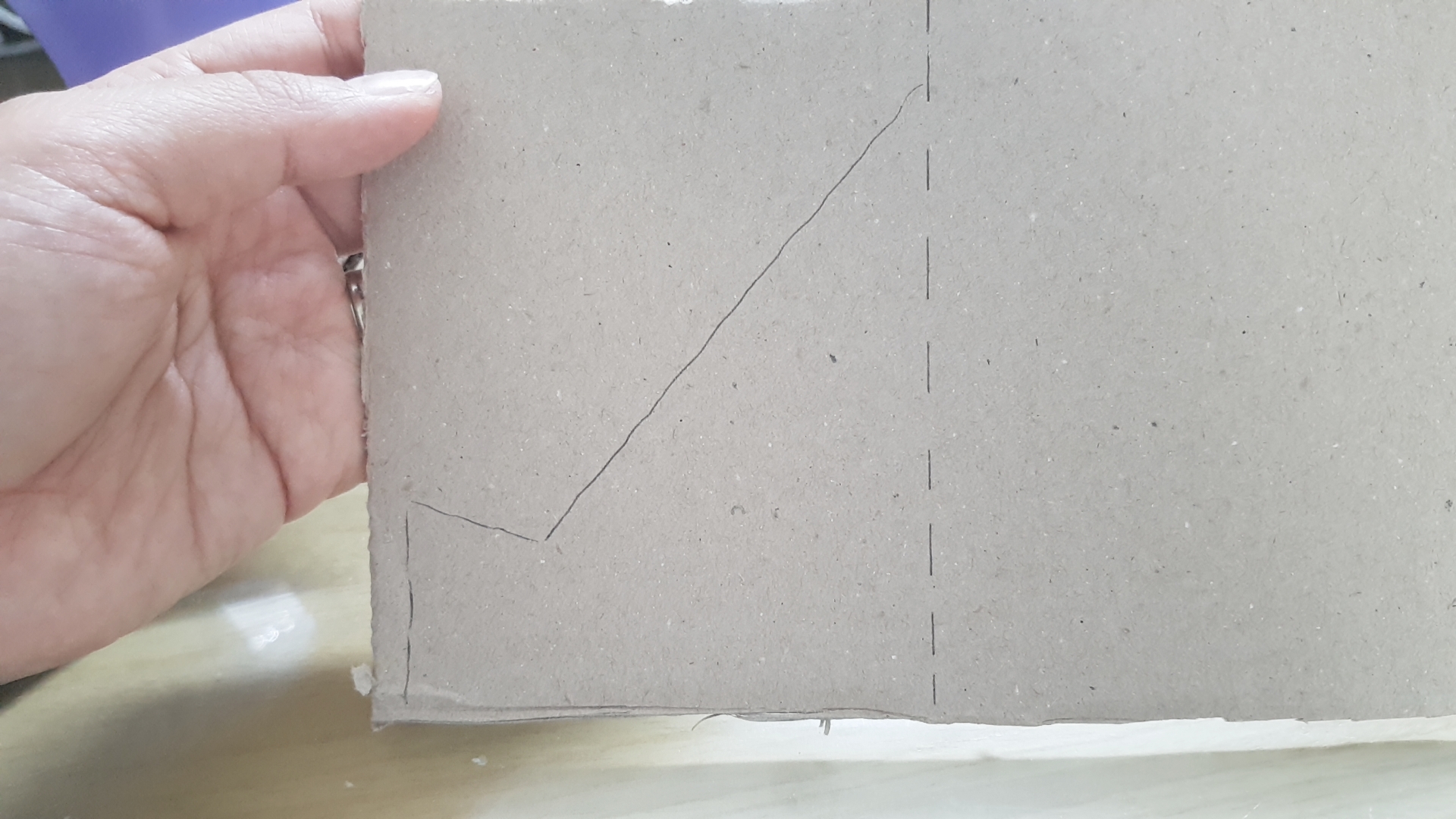 2. 정가운데 점선을 그려주고, 왼쪽편에 약 45도 각도로 대각선을 그려줍니다. (핸드폰이 기대어지는 면이 될 예정이에요.) 그리고 대각선 아래부분은 아래 사진처럼 꺾어진 형태로 그려줍니다. (핸드폰이 놓여지는 면이 되겠죠!)
