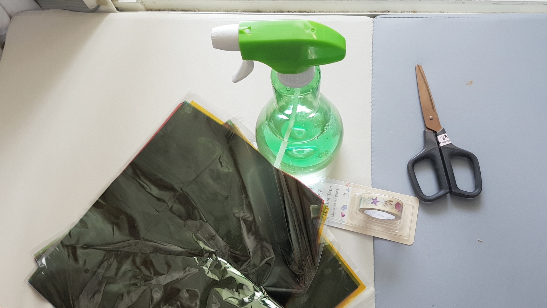 셀로판지, 가위, 마스킹 테이프, 분무기