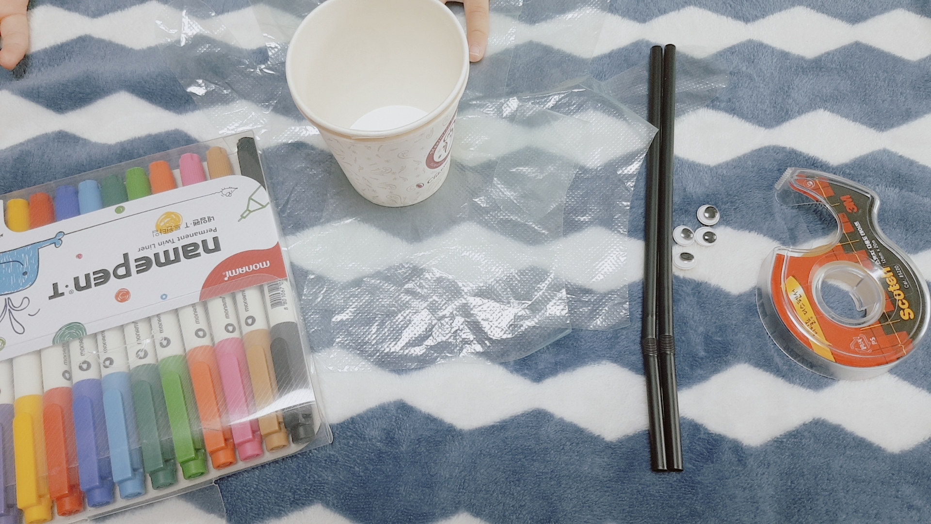 일회용비닐장갑, 빨대, 네임펜, 테이프, 무빙아이, 종이컵