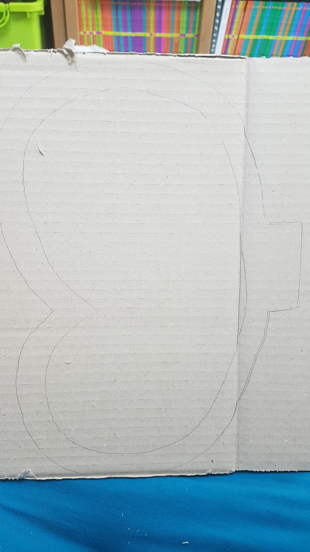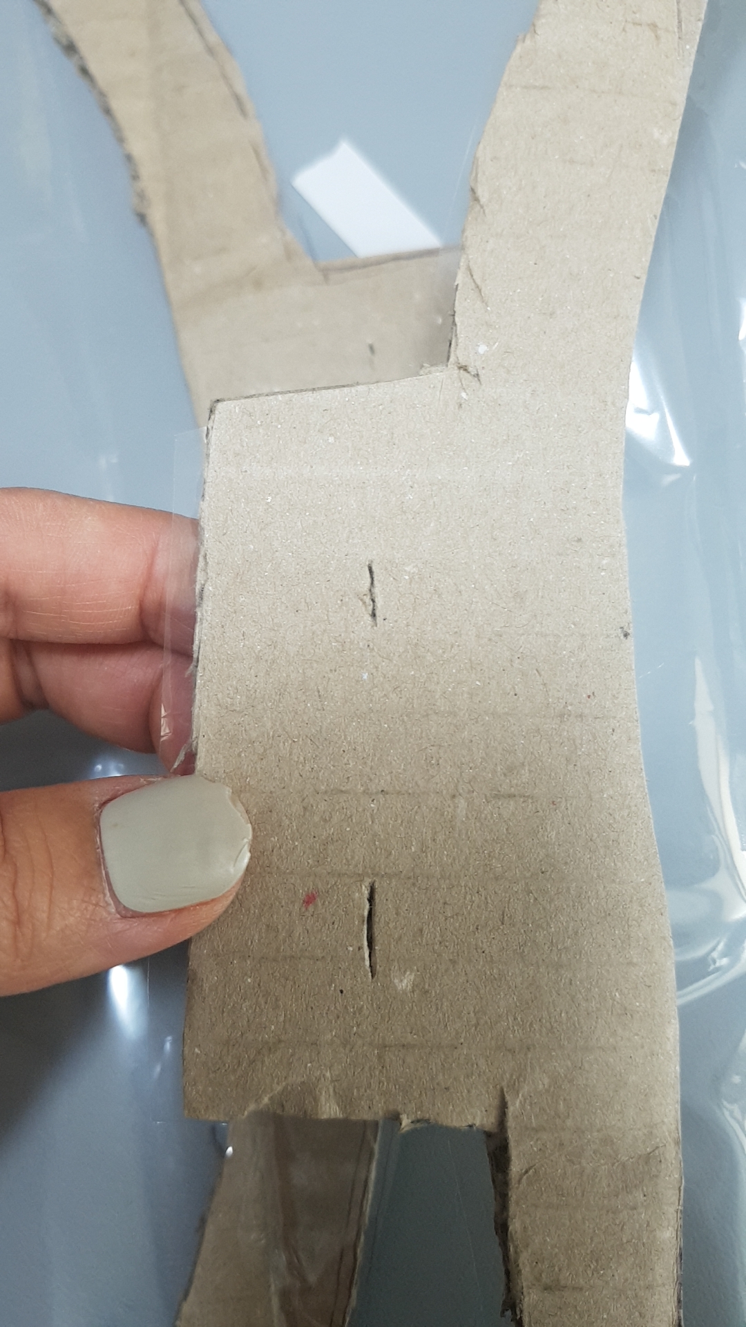 6. 이제 가운데 구멍을 내주세요. 어깨에 멜 수 있도록 고무밴드를 집어넣을 구멍을 칼집 내어 뚫어줍니다.