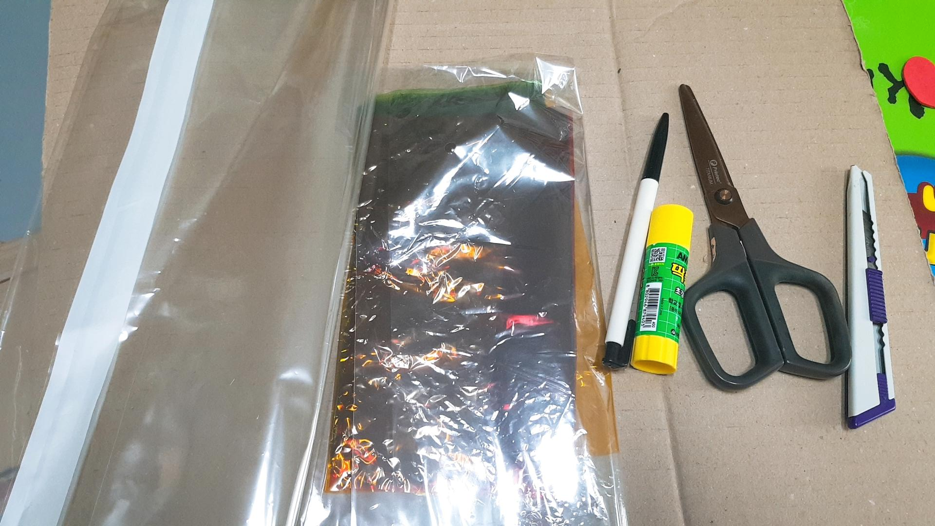 택배상자(두꺼운종이), 셀로판지, 비닐봉투, 칼, 가위, 풀, 양면테이프