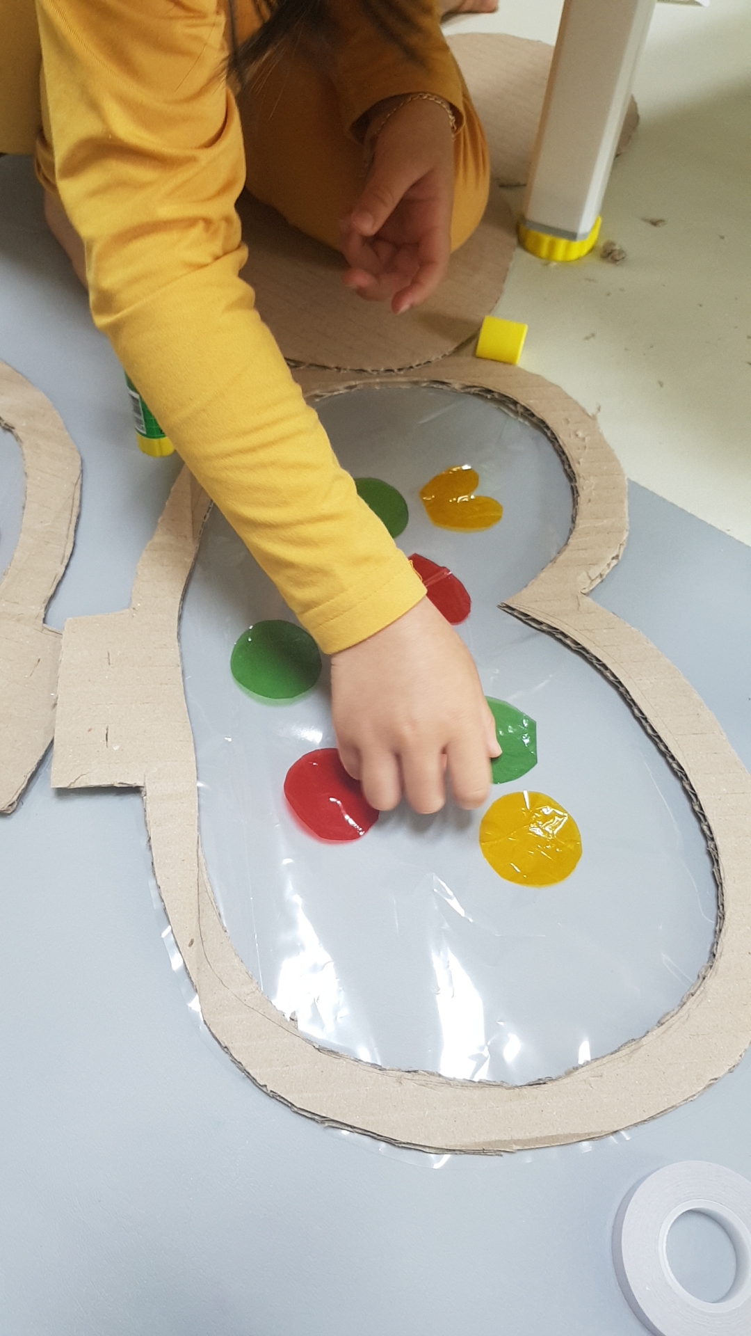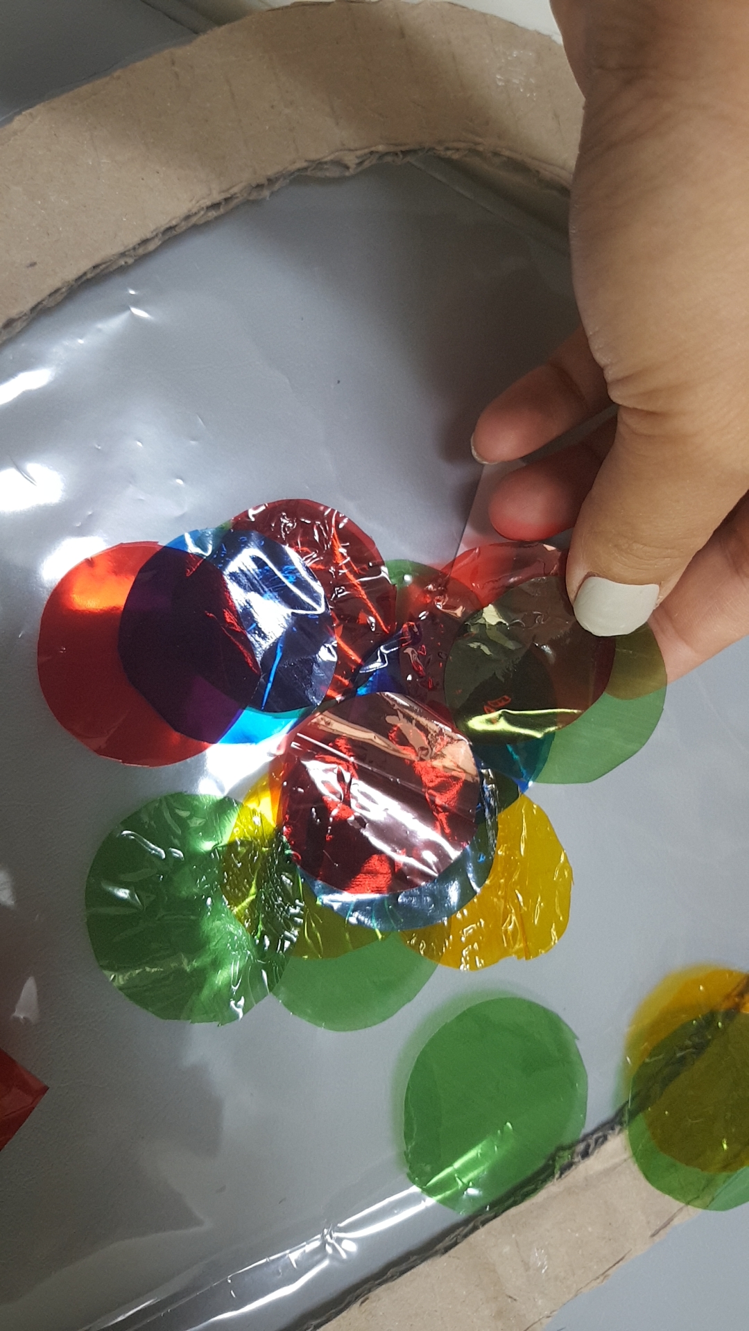 7. 셀로판지를 다양한 모양으로 오려주세요. 별, 하트, 네모, 동그라미~