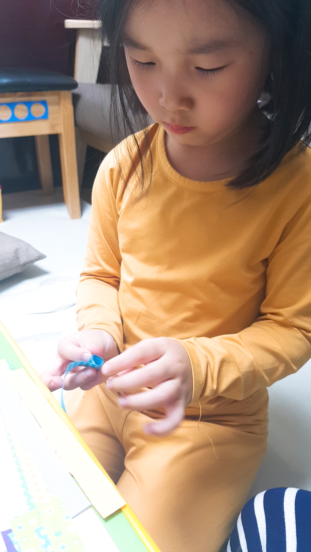 이제 여인의 머리에 붙여주세요. 참고로 위에서부터 붙이며 내려오는 게 좋아요. 안그러면 말린부분이 펴져서 위에 있는 테이프에 붙어버리거든요. 우리 꼬마는 나름 고집있는 아이~ 자기가 하겠다며 엄마 말은 듣지 않는 ㅎㅎㅎㅎㅎ 참을 인을 마음에 새겨봅니다~^^