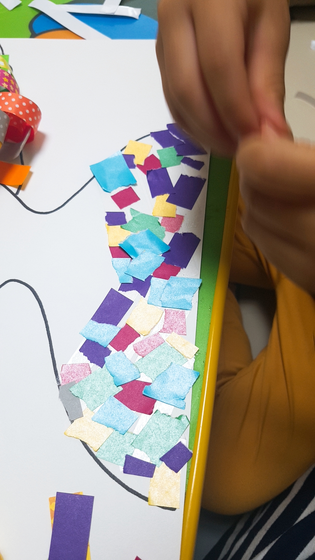 머리가 완성되었으면 아래 여인의 옷을 꾸며야하는데요. 여기는 색종이를 찢어 붙이기로 했어요. 우리 꼬마가 그렇게 하자고 하네요. 원하는 거 다하렴~ㅎㅎㅎ