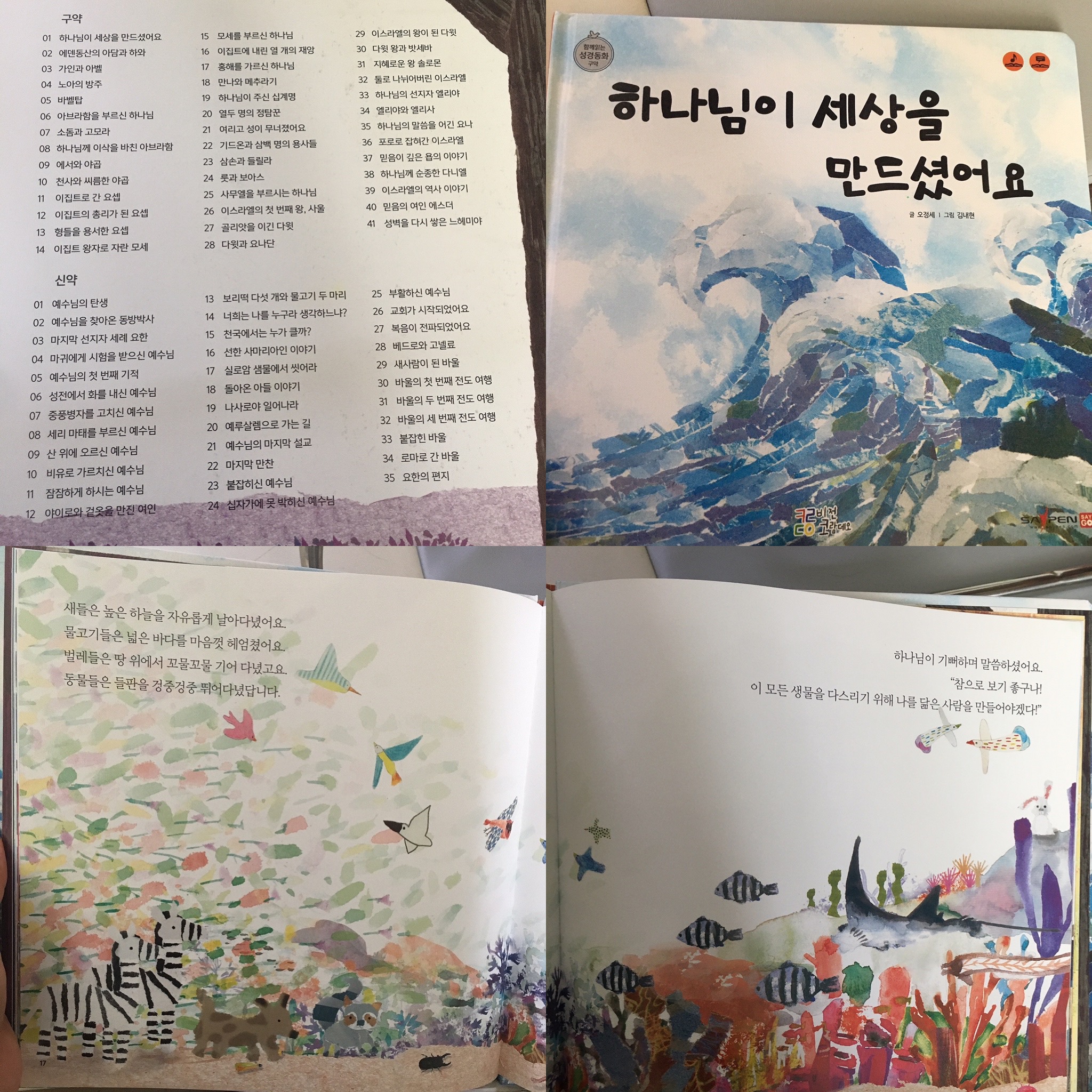 장점은 당연히 세이펜이 가능하다는 점이에요. 글은 오정세 목사님이 쓰셨고, 그림은 책마다 다양한 작가님이 그리셨어요. 그래서 그림은 책마다 느낌이 다 다른데요. 그것도 아이들에게는 좋은 경험이 될 수 있을 것 같아요.