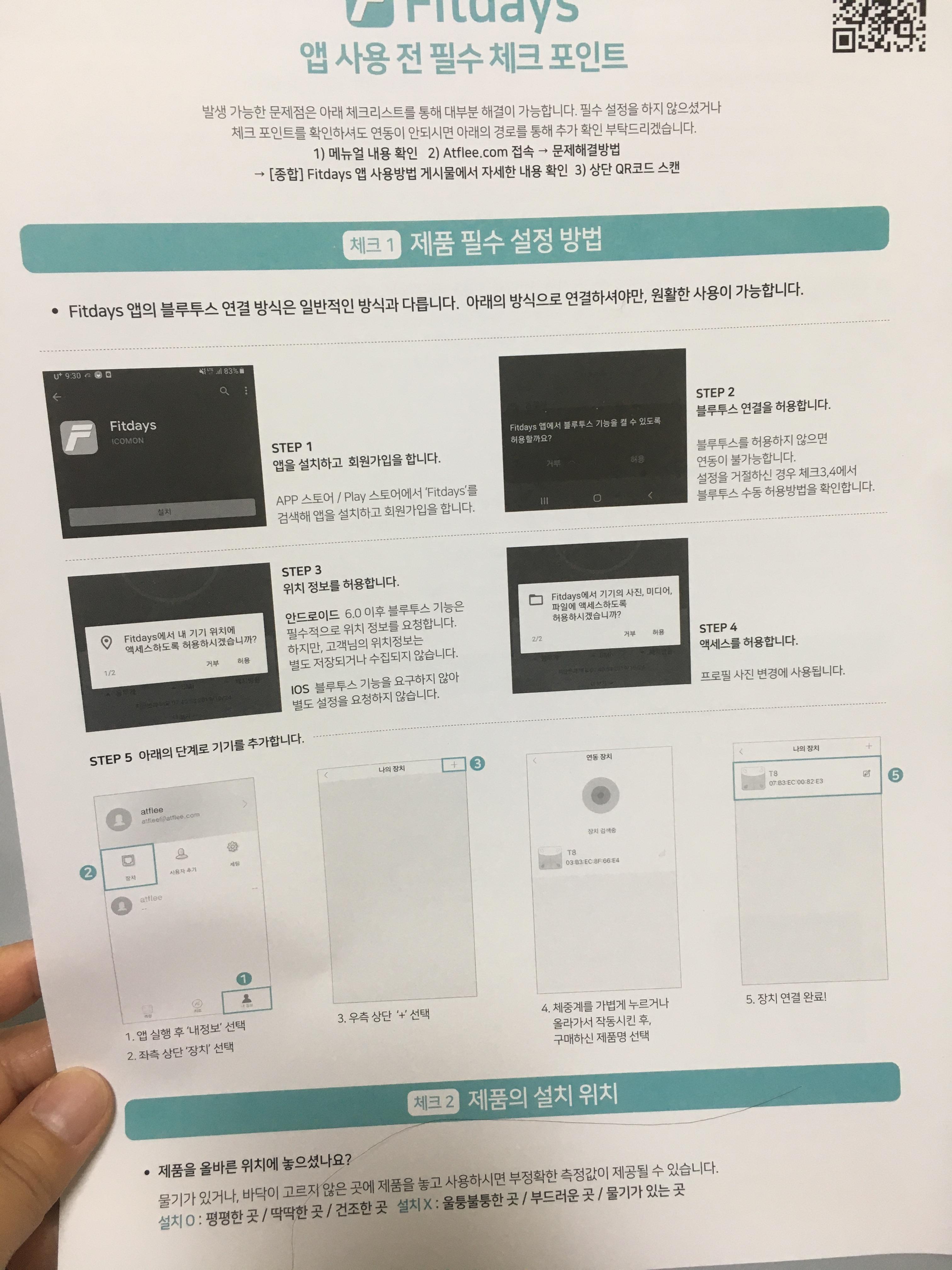 fitdays 어플을 설치해주세요. 안드로이드는 위치정보를 허용해야 합니다. 여튼 모든 팝업을 다 허용하고, 회원가입을 합니다. 로그인 후 사용자 설정을 해주세요. 키, 몸무게, 연령, 성별.. 등등 기록한 후 측정할 수 있습니다. 당연히 블루투스는 켜놓으셔야지요~
