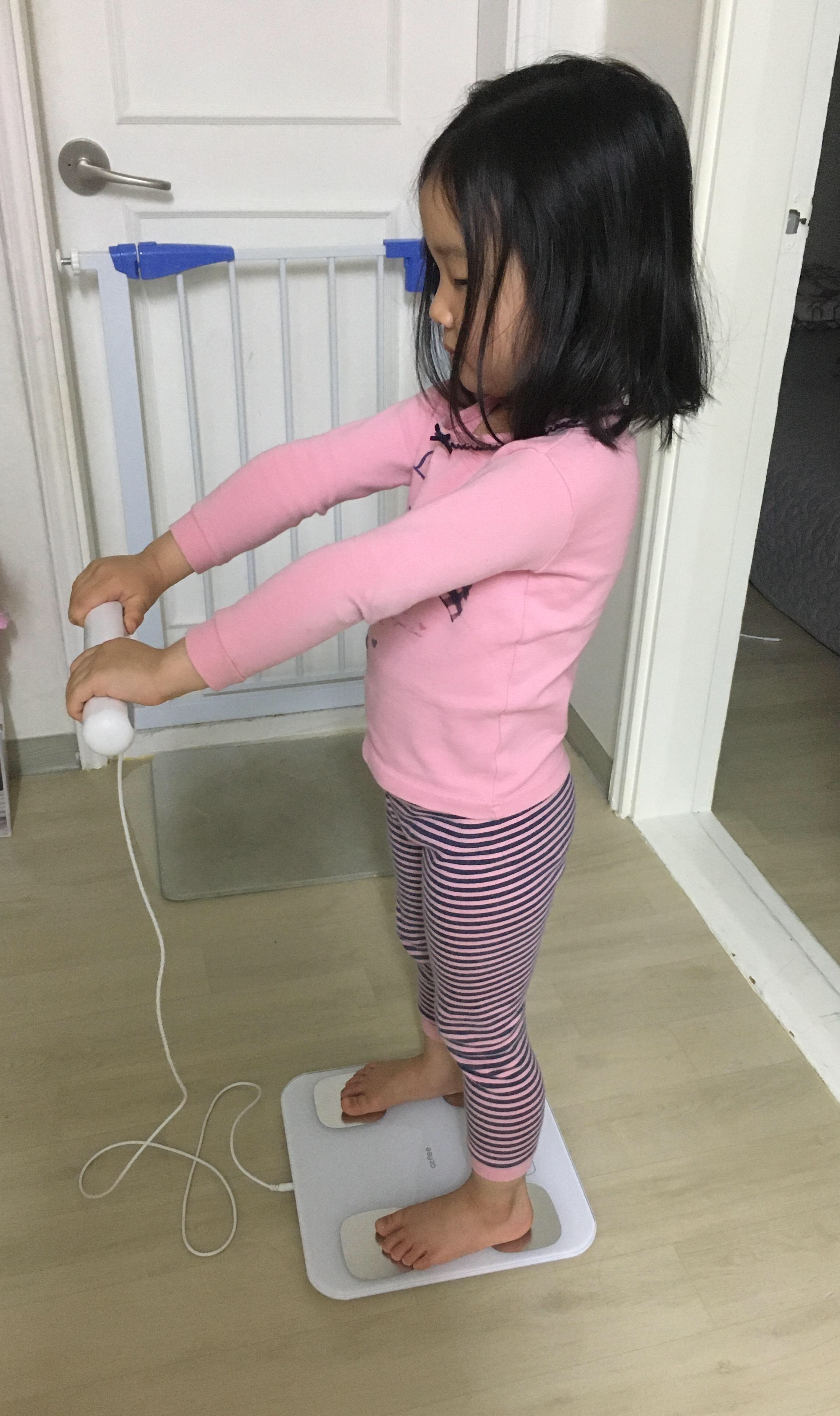 여튼 우리 딸램이 한번 올라가게 해봤어요.ㅎㅎㅎ 팔은 쭉 펴고~ 정면 응시한 후 10초 정도 있으면 폰에서 띵동 소리가 나요. 측정이 다 되었다는 소리예요. 덕분에 온 가족이 다 체지방 측정을 해봤네요.^^